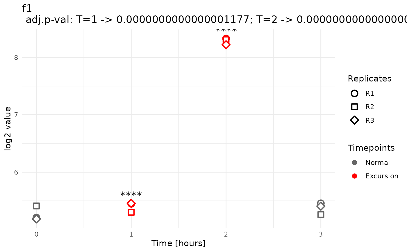 A named list of ggplot objects, where each element corresponds to a feature with at least one detected peak or valley. Each plot shows expression profiles across timepoints, highlights excursions in red, and annotates significant excursions with significance stars.